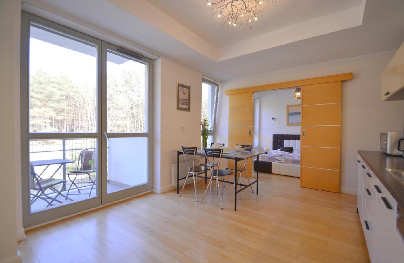 Apartament z balkonem. This apartment comes with 1 bedroom, a kitchenette and 1 bathroom with a walk-in shower and a hairdryer. In the well-equipped kitchenette, guests will find a stovetop, a refrigerator, a dishwasher and kitchenware. This apartment has a washing machine, a coffee machine, a flat-screen TV and a balcony. The unit has 2 beds. Apartament - 4 osobowy. Powierzchnia pokoju ok.: 55 mkw.